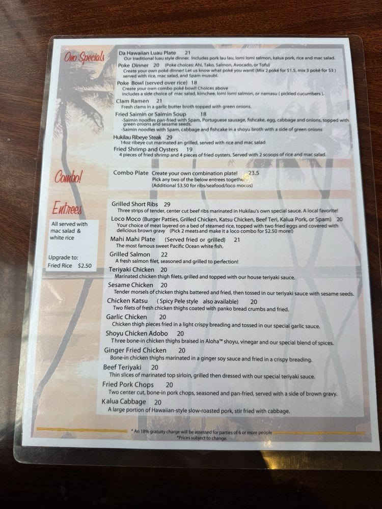 “ This place is amazing and if you haven't been, you need to get over and check it out ASAP. We went on a mission to try as much as possible, so we ordered a mixed 2 poke appetizer, spam musubis, Hukilau fried rice with egg, Kalua pork cheese quesadilla, and a Combo plate with loco moco and chicken katsu. Everything was great and portions were large. Prices were very reasonable for what we got. With all of that + tax and tip, we got out of there for under $100, and had loads of leftovers - 3 almost full boxes to be exact. While everything was pretty damn good, my personal favorites were the Kalua pork cheese quesadilla (a mind blowing quesadilla experience tbh) and the poke. I'd absolutely get these again, but I'd also get everything else again. Metered street parking is available in the area, I had to circle and park a little further away, but the area is nice and and it was fun to walk by the other shops and restaurants. ”
